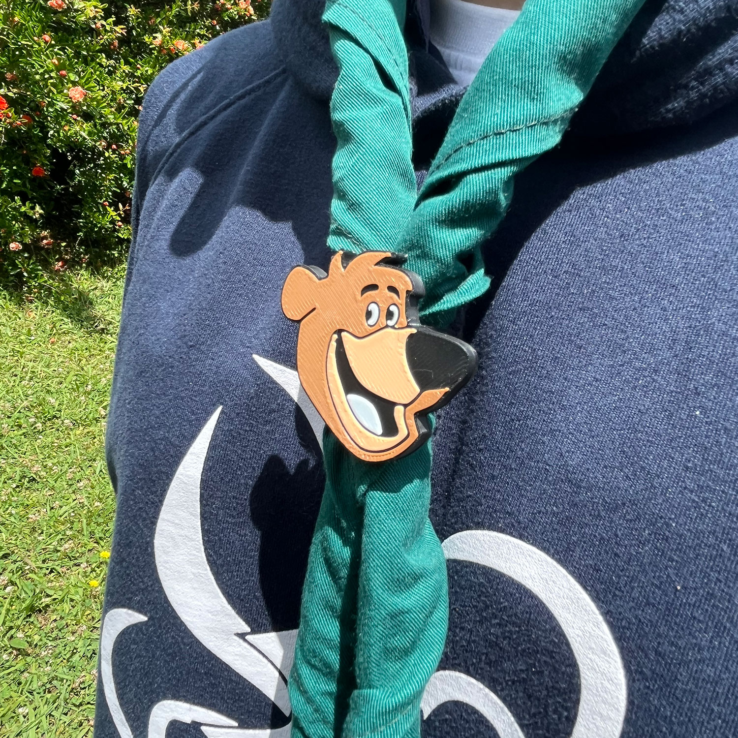 • Lenço verde com presilha do Urso Yogui e t-shirt azul escuro com estampa branca no jardim