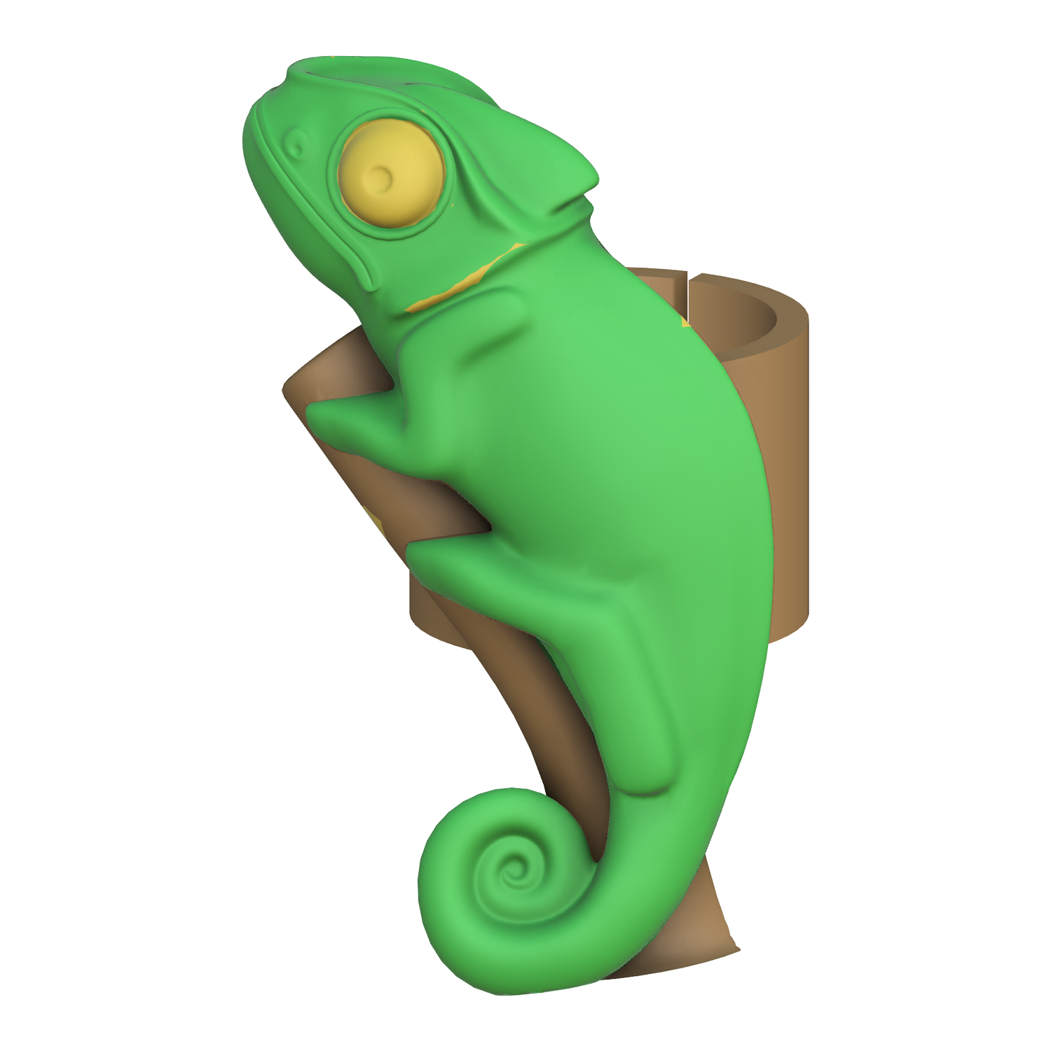 Figurinha de camaleão verde com suporte castanho em forma de ramo