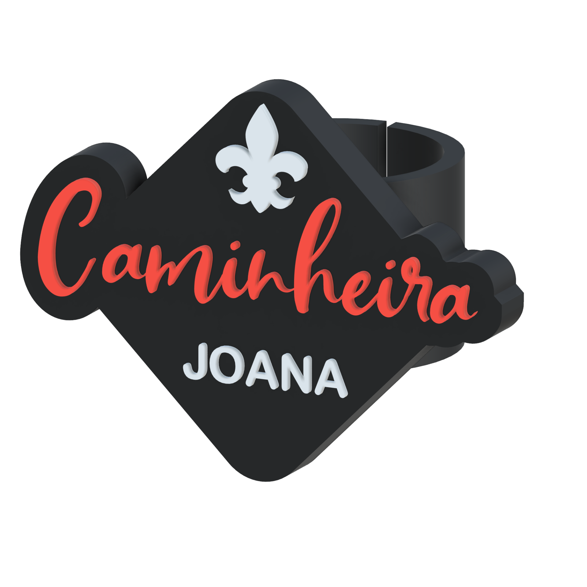 • Anel preto com texto Caminheira em vermelho, JOANA em branco e símbolo de flor-de-lis branco.