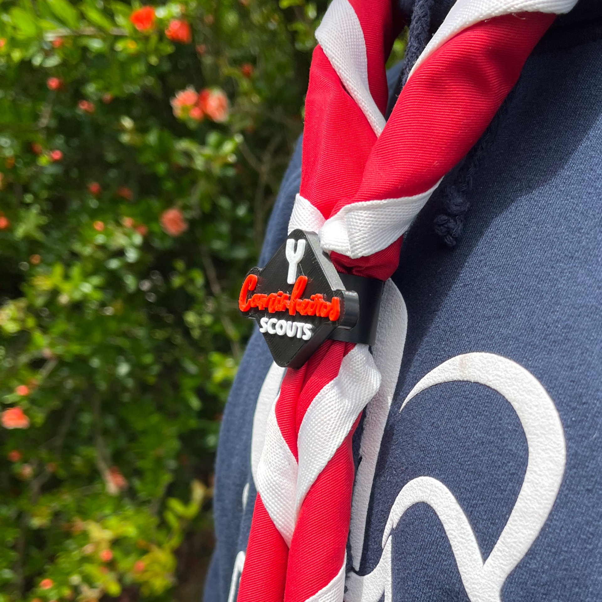 • Lenço scout tricolor em vermelho, branco e azul com anel preto