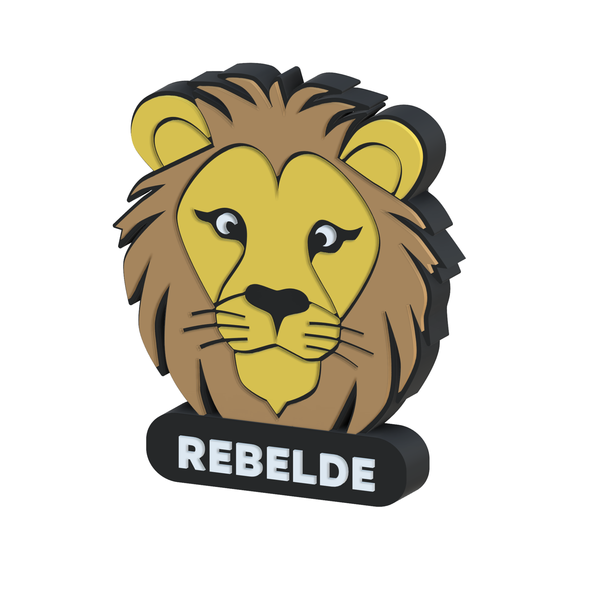 • Elemento 3D de leão amarelo e castanho com a palavra REBELDE em base preta