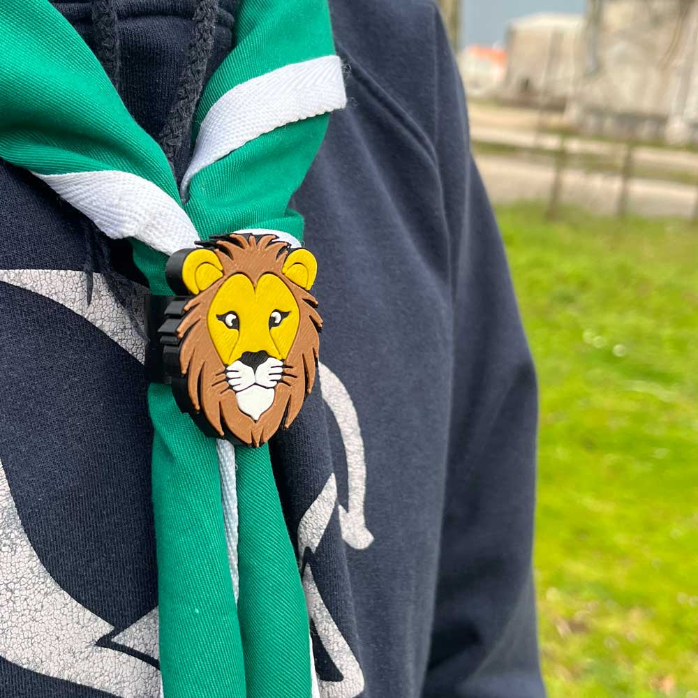 • Lenço de escoteiro verde com anel de cabeça de leão em madeira