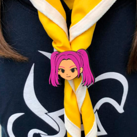 • Lenço branco e amarelo com amuleto rosa com rosto de desenho animado sobre t-shirt preta com padrão branco