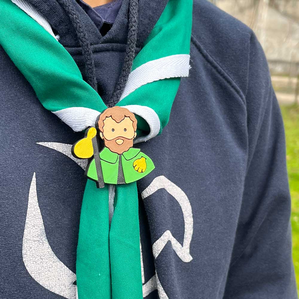 • Cachecol verde e branco com presilha de madeira em figura masculina usado sobre camisola azul escura, em exterior