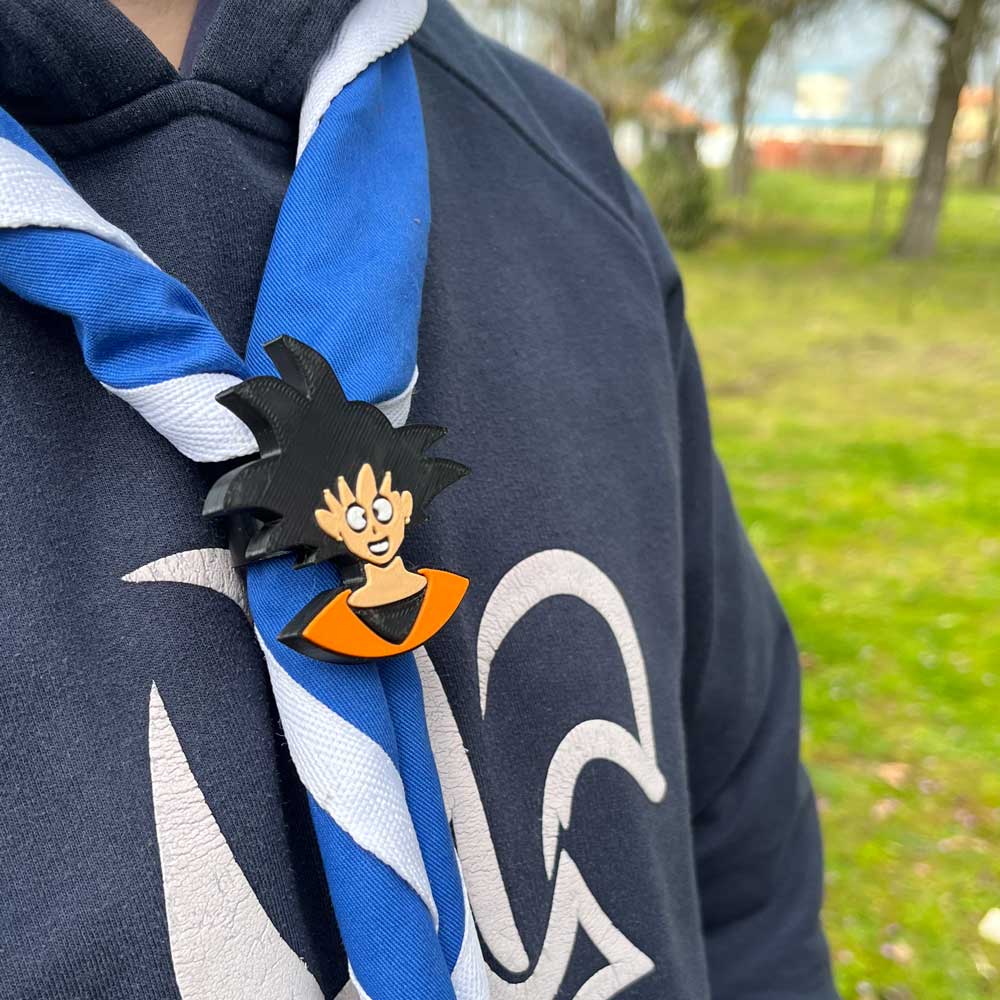 • Lenço azul e branco com distintivo Goku e hoodie azul escuro em ambiente exterior