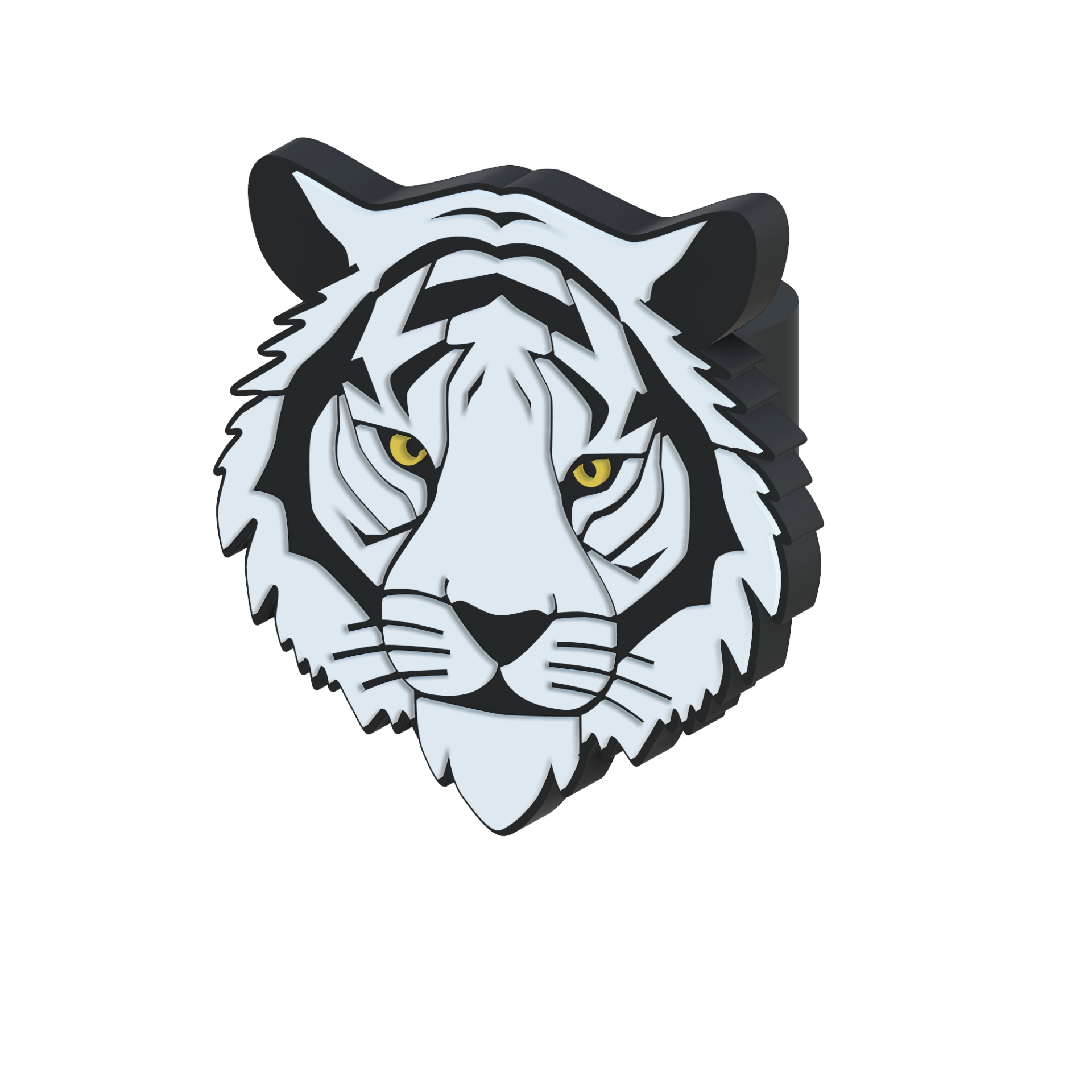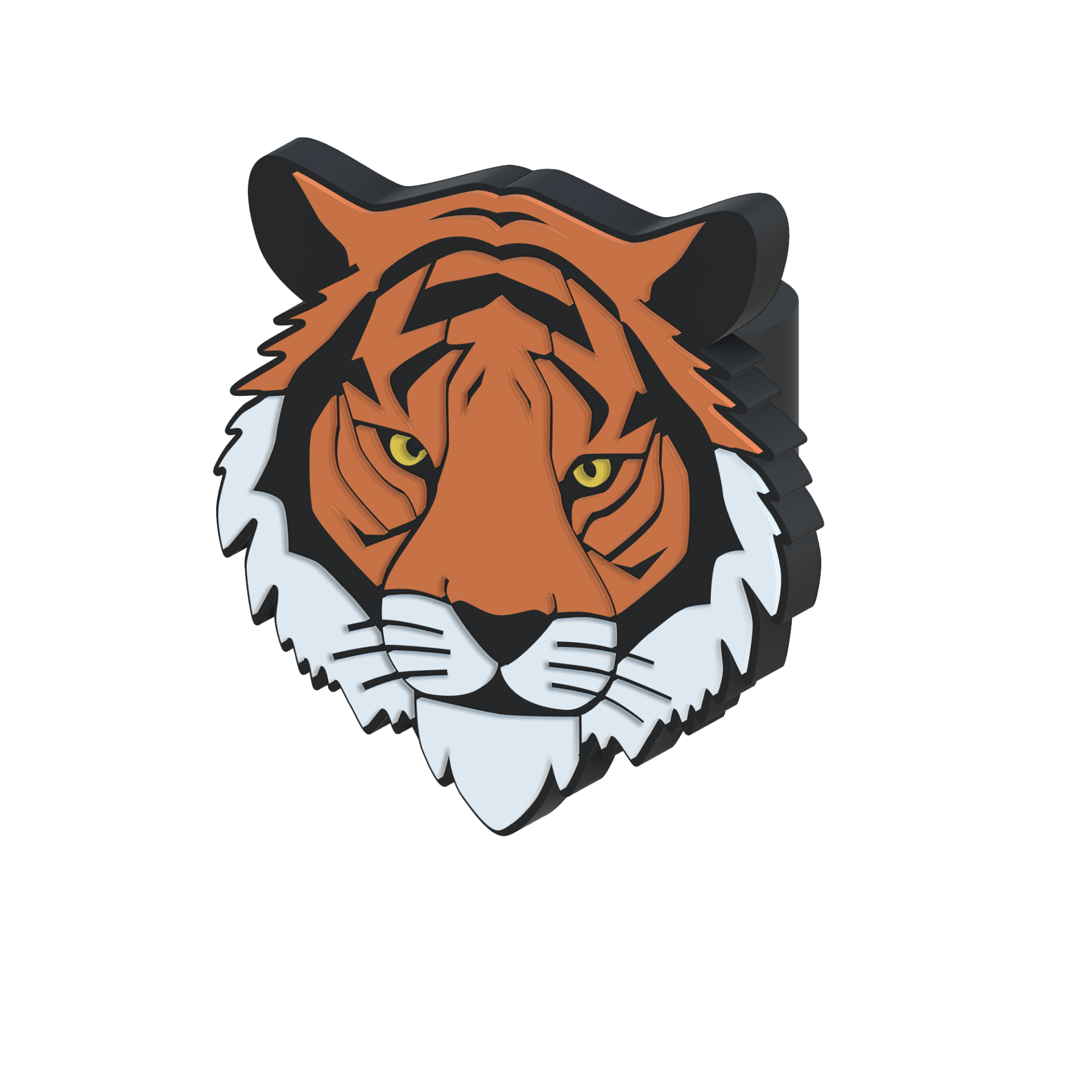 • Cabeça de tigre estilizada em camadas tridimensionais com cores laranja, preto, branco e olhos amarelos.
