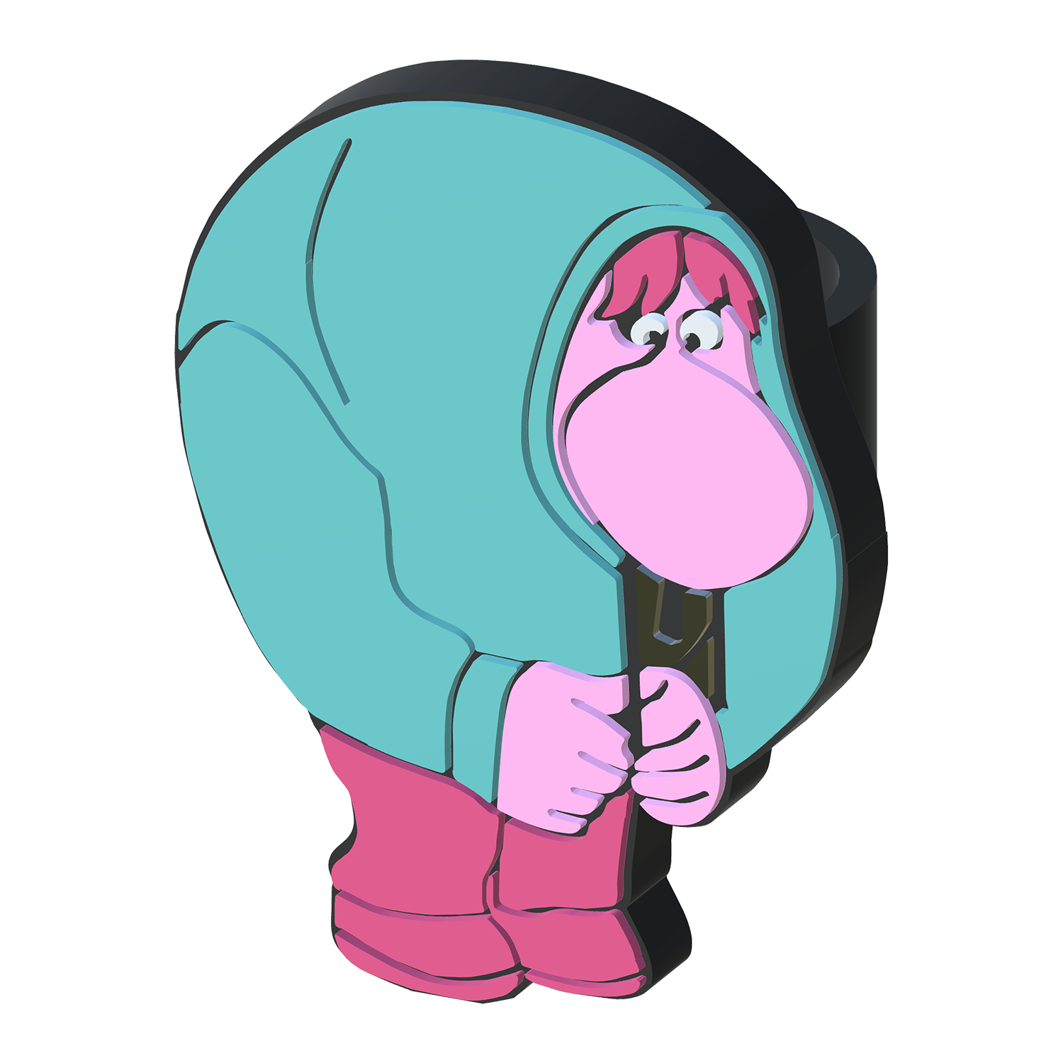 • Personagem animado cor-de-rosa com capa azul-turquesa e botas rosas