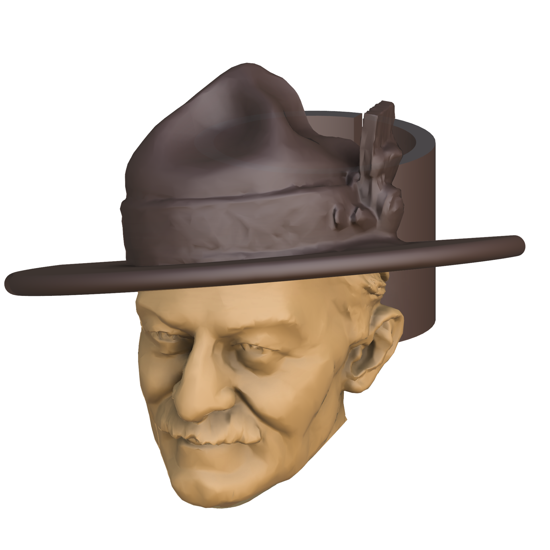 Cabeça masculina esculpida com chapéu castanho e pena