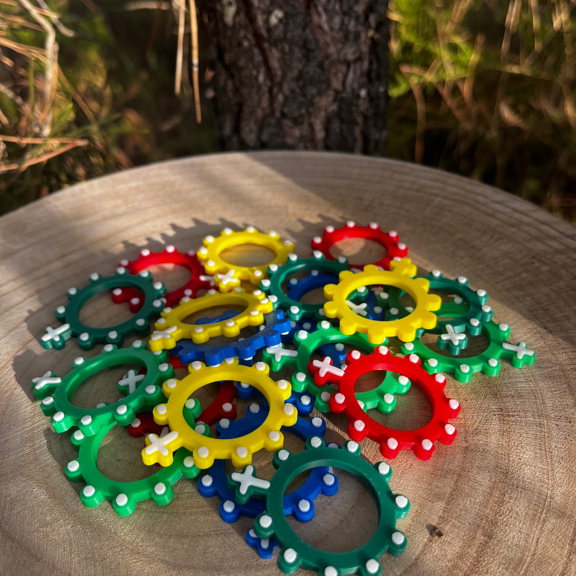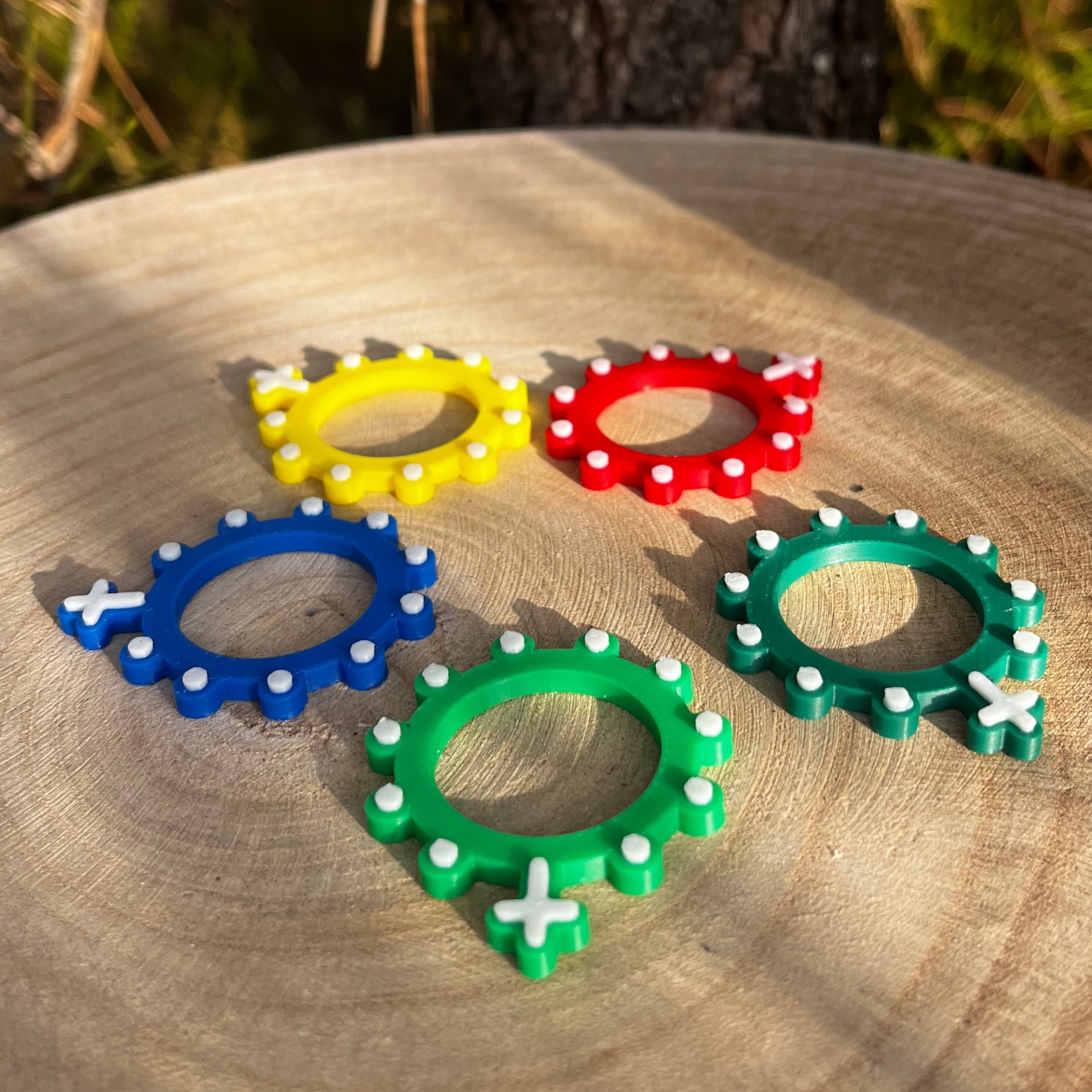 • Conjunto de anéis coloridos com cruzes e círculos brancos