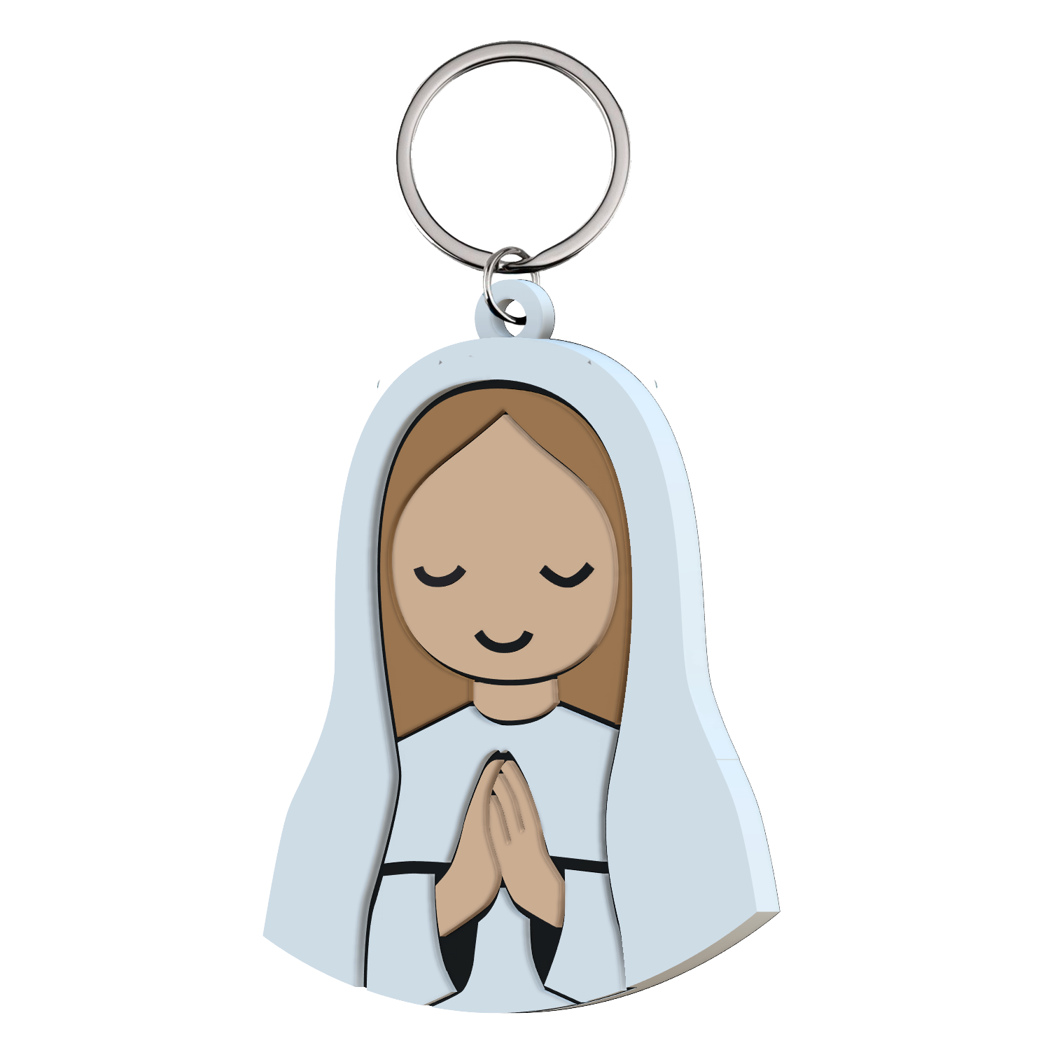 • Porta-chaves com figura feminina em oração, vestindo manto azul claro