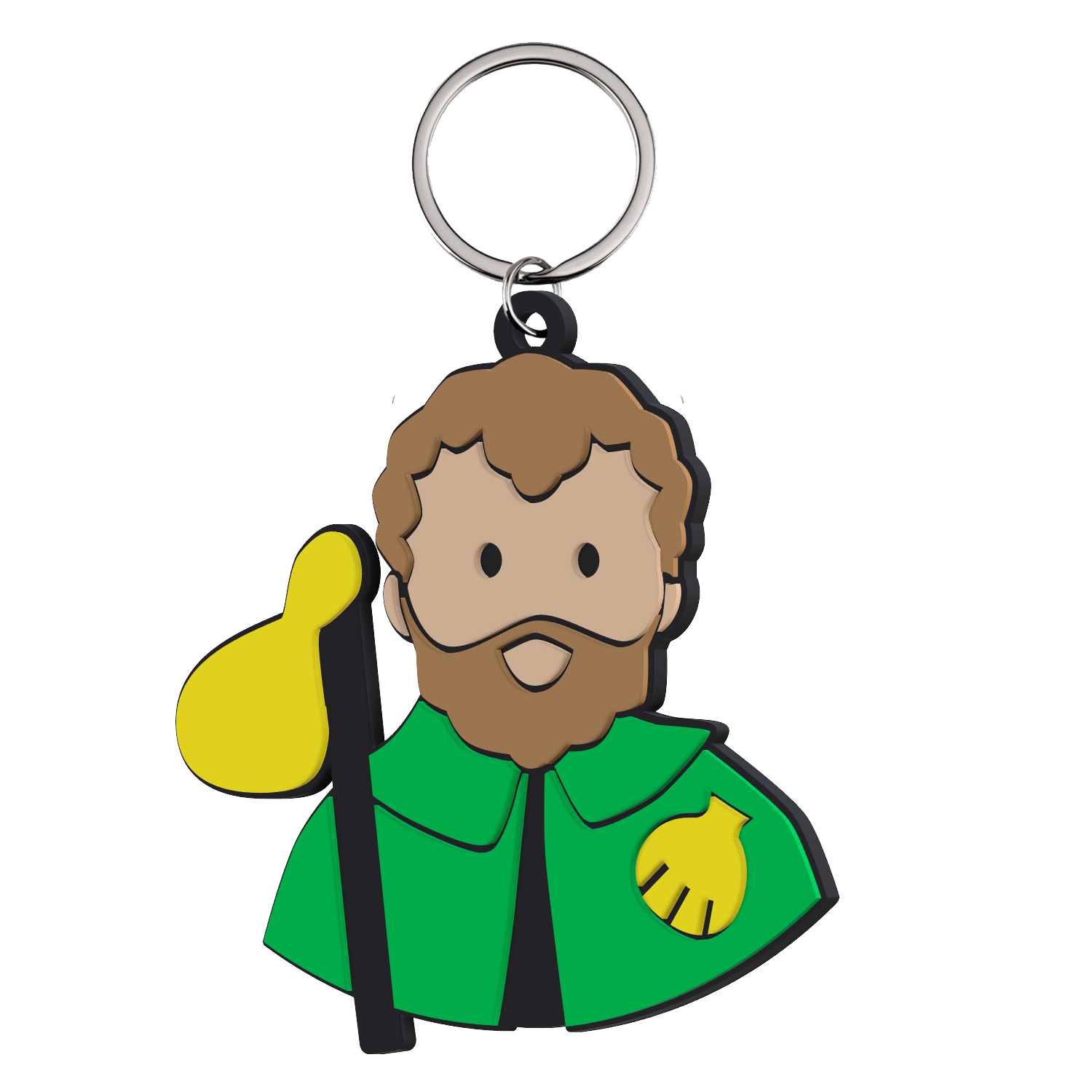 • Chaveiro colorido em forma de personagem com casaco verde e barba castanha pendurado numa calça azul