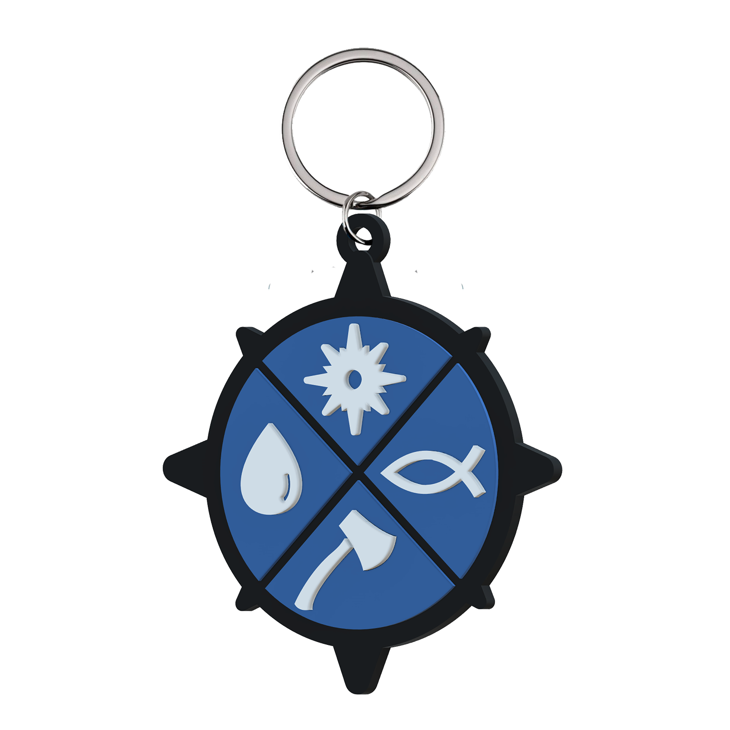 • Porta-chaves de borracha azul e preto com símbolos em relevo branco