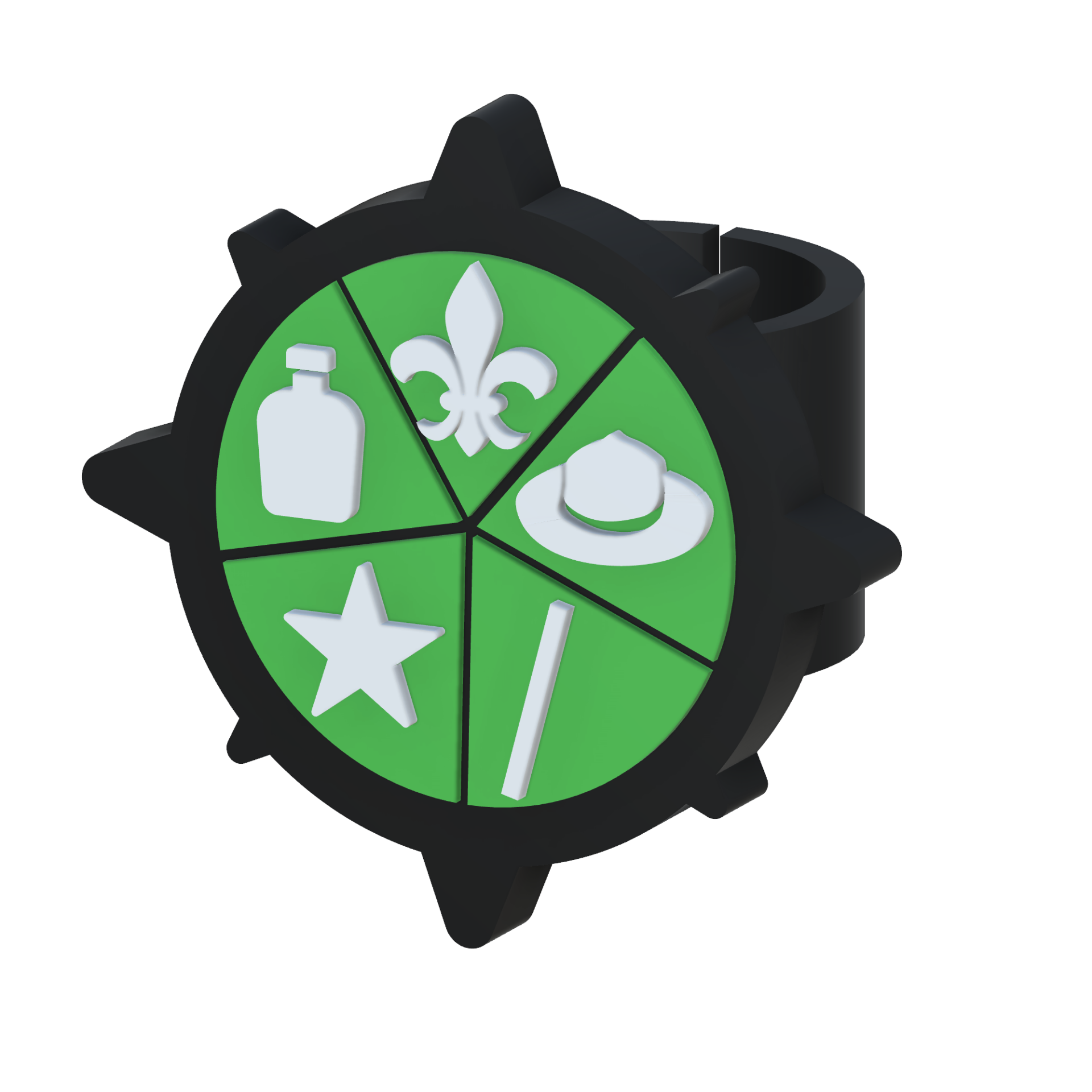 Anel preto com superfície redonda verde e ícones brancos