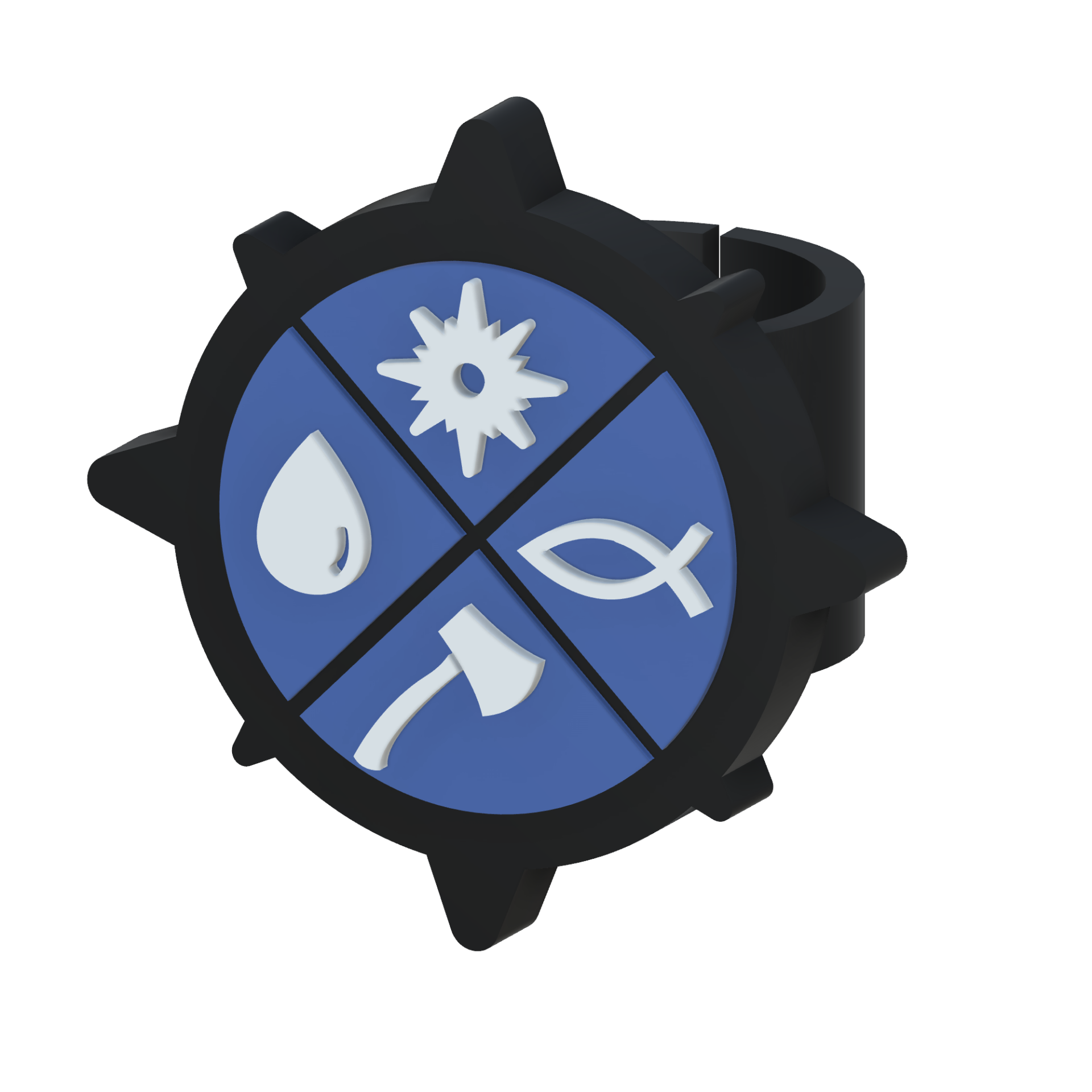 • Anel preto com centro azul e símbolos brancos